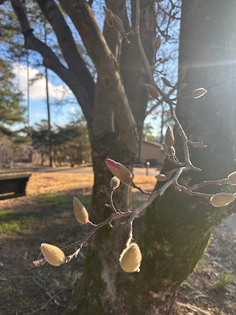 I think our Saucer Magnolia tree will bloom this week. Last year a hard freeze zapped the blooms right before it burst open in its show-offy display, like some kind of mean-spirited joy killer warning her not to get too big for her britches. I am hopeful that we will get at least a few days of her lavender pink glory this year. I still believe that beauty is necessary for our humanity, that there is something deep within us that knows it and needs it and longs to share it with one another.